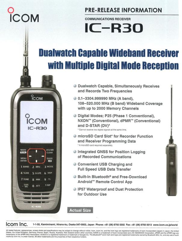 O ICOM IC-R30 cobre uma ampla faixa do espectro, de 100kHz a 3304,999 MHz (3,3 GHz), exceto celular. Recepção em FM, WFM, AM, USB, LSB, CW, D-STAR, APCO P25 Fase 1, NXDN, dPMR e DCR. Tem 2000 memórias e consegue escanear 200 canais por segundo. Recursos de NB, Ganho de RF, Sintetizador de voz, Bluetooth, GPS, Display com espectro e dupla recepção incluindo analógico/analógico e analógico/digital. Tem ainda recurso de dupla gravação. O rádio aceita um cartão microSD em sua porta microUSB. Construído dentro do padrão militar IP57 (MIL-STD 810G). O software CS-R30 opcional opera com Windows 10, 8.1 e 7.